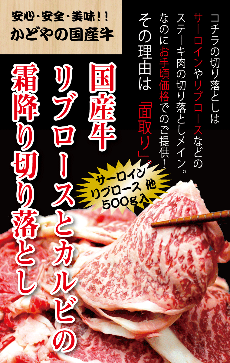 国産牛リブロースとカルビの霜降り切り落とし500g面取り 焼肉 BBQ ステーキ かどや牧場