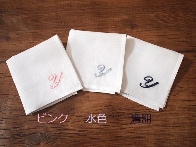 【サイズ】 15cm × 15cm 【カラー】 白(ハンカチ)/ ピンク・水色・濃紺(イニシャル刺繍) 【素 材】 コットン100% ◇ 商品のオプションより、イニシャルと刺繍の色をお選び下さい。